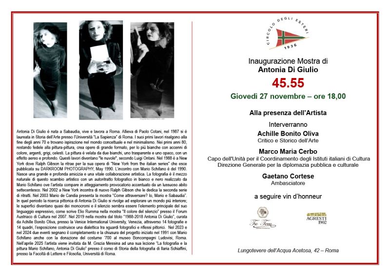 Su tale Evento – inaugurato Giovedì 27 Novembre riguardante la mostra personale di Antonia Di Giulio, intitolata “45.55” – sono stati pubblcati anche altri interventi a cura del “Giornale Diplomatico“, della “Gazzetta Diplomatica” e di “Books for Peace“, scusandoci per eventuali omissioni.