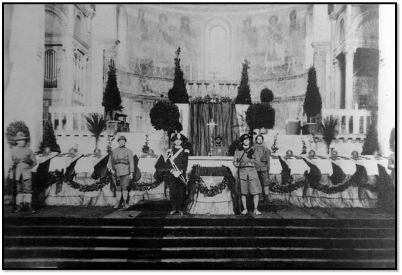 La mattina del 4 Novembre la Solenne Liturgia veniva nuovamente celebrata dal vescovo di Trieste, Monsignor Bartolomasi. Figura di rilievo, era stato al fronte durante la guerra, sempre vicino ai soldati e ai cappellani militari. Costui aveva benedetto ad Aquileia le undici salme con l’acqua del Timavo, il fiume che bagna il confine tra Italia, Croazia e Slovenia, terre dove si combatté la Grande Guerra e aveva seguito il feretro da Aquileia a Roma.