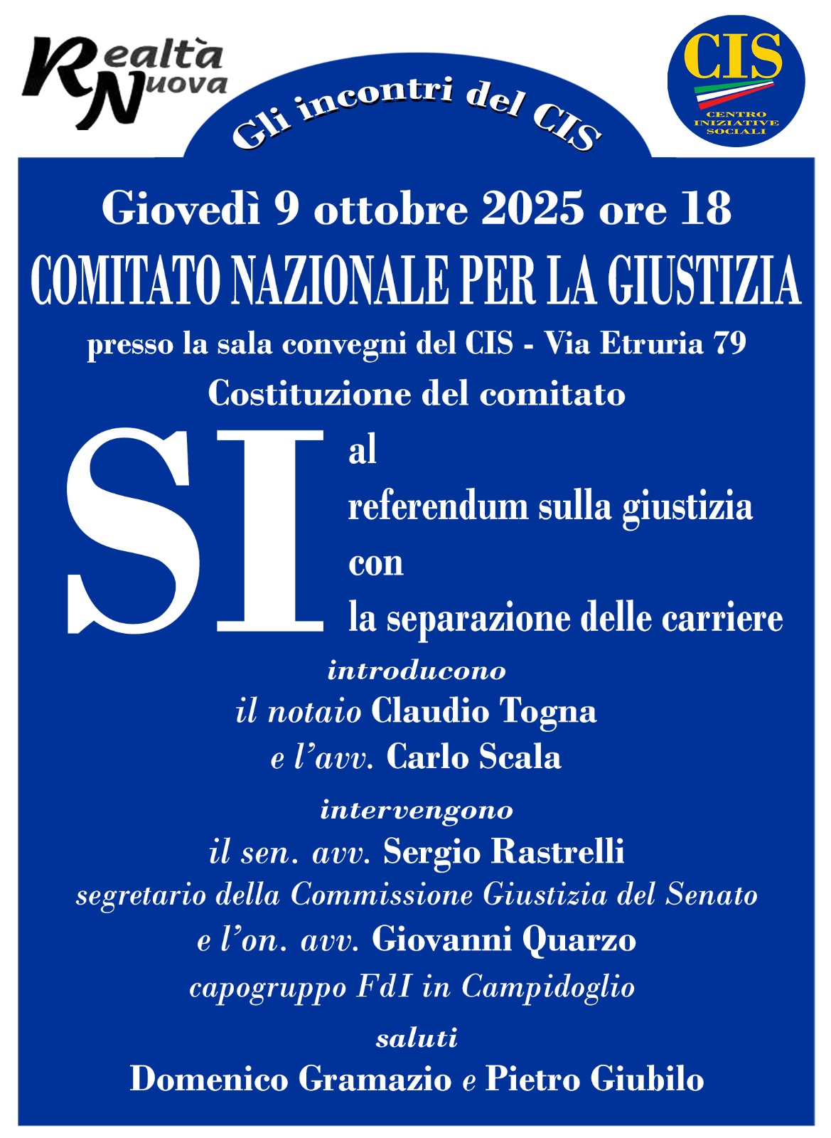 Dalla Redazione di Realtà Nuova l’annuncio della costituzione in Italia del 1° Comitato per il SI per il Referendum Costituzionale per la Separazione delle Carriere nella Magistratura